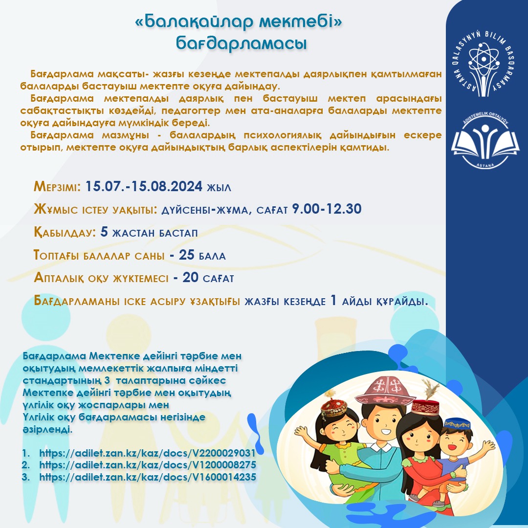 «Арт – терапия басым бағыттағы №45 «Самұрық»» балабақшасында балаларды мектепке дайындау бойынша "Балақайлар мектебі" жұмысын бастайды. Бұл жобаға балабақшамен қамтылмаған 5 жастан асқан балалар қатыса алады. Бағдарламаны іске асыру мерзімі жазда 1 айды құрайды. Ұйымдастырылған іс - шаралардың/сабақтардың кестесін білім беру ұйымы бекітеді. 2024 жылғы 15 шілдеден 15 тамызға дейін. Топтағы балалар саны 25 адамнан аспайды. Апталық оқу жүктемесі 20 сағаттан аспауы керек.