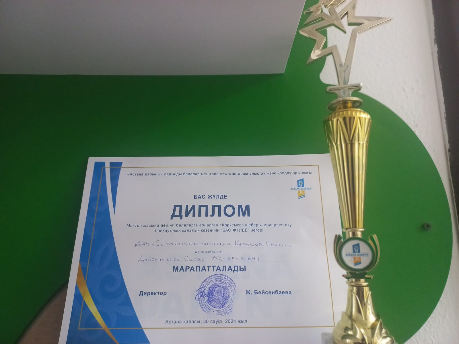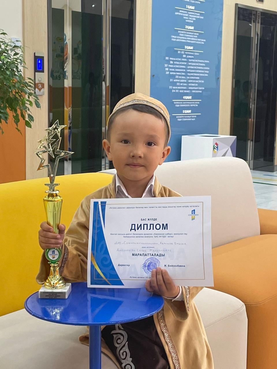 «Астана дарыны» дарынды балалар мен талантты жастарды анықтау және қолдау Мектеп жасына дейінгі балаларға, мектепалды даярлық топтары арасында «Көркемсөз шебері» мәнерлеп оқу байқауының қалалық іріктеу кезеңіне «Өнер» тобы тәрбиеленушісі Каримов Ерасыл калалық кезенде Гран- при иесі болды