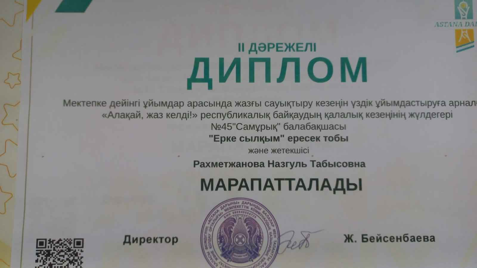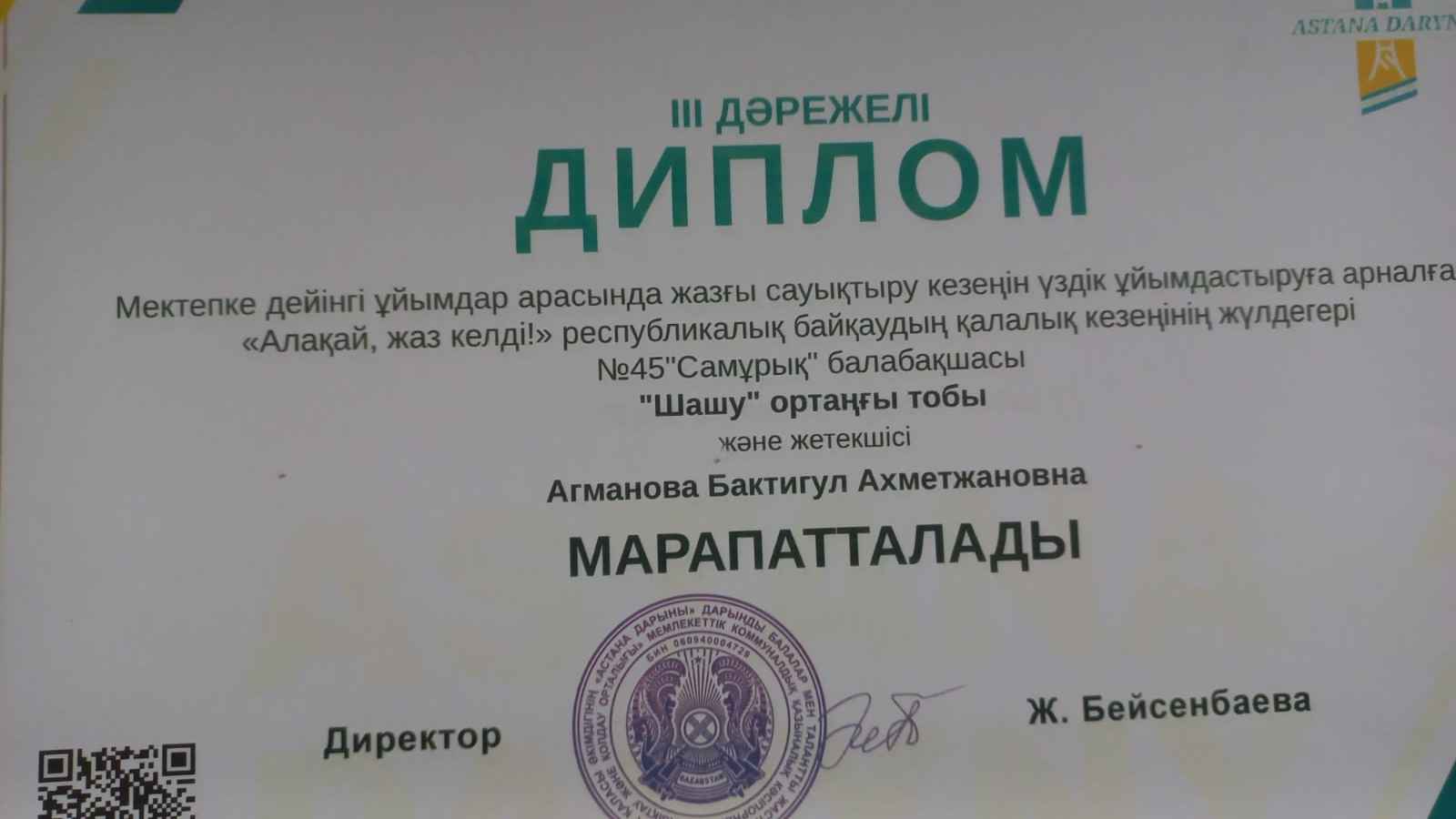 Мектепке дейінгі ұйымдар арасында жазғы сауықтыру кезеңін үздік ұйымдастыруға арналған «Алақай, жаз келді!» республикалық байқаудың қалалық кезеңі қорытындысы 2024 жылдын 21 мамыр айында «Астана дарыны» дарынды балалар мен талантты жастарды анықтау және қолдау орталығы ҚР ОАМ «Балаларды ерте дамыту институты» РММ-нің 2024 жылға арналған жұмыс жоспарына сәйкес жазғы сауықтыру кезеңін ұйымдастыру үшін қауіпсіз, жайлы және креативті ортаны құрудың озат тәжірибесін жинақтау және тарату мақсатында «Алақай, жаз келді!» (бұдан әрі – Байқау) бейнероликтер республикалық байқауының қалалық кезеңін ІІ, ІІІ дәрежелі дипломдарға ие болды ортанғы «Шашу» тобы ІІ орынға тәрбиешісі Агманова Бактигул Ахметжановна