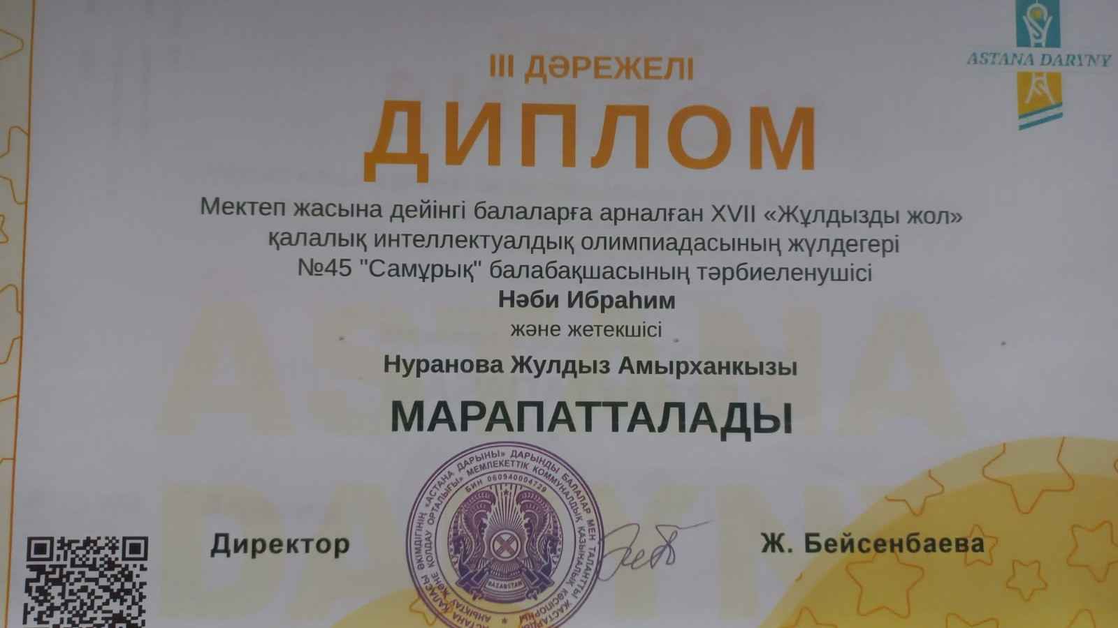 мектепалды «Қара Жорға» тобының бүлдіршіні Нәби Ибраһим қатысып жүлделі ІІІ орынға ие болды