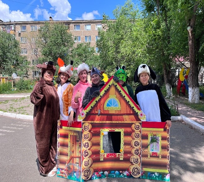 Мақсаты :Балаларға ертегінің мазмұнын қойылым арқылы түсіндіру. Жабайы аңдар туралы білгендерін естеріне түсіру. . Баланы ертегі кейіпкерлерін өздері айтуға,қимыл-қозғалыс, дауыс ырғағын келтіре білуге үйрету. Байланыстырып сөйлеуге дағдыландыру, ойын арқылы қызығушылығын арттыру.