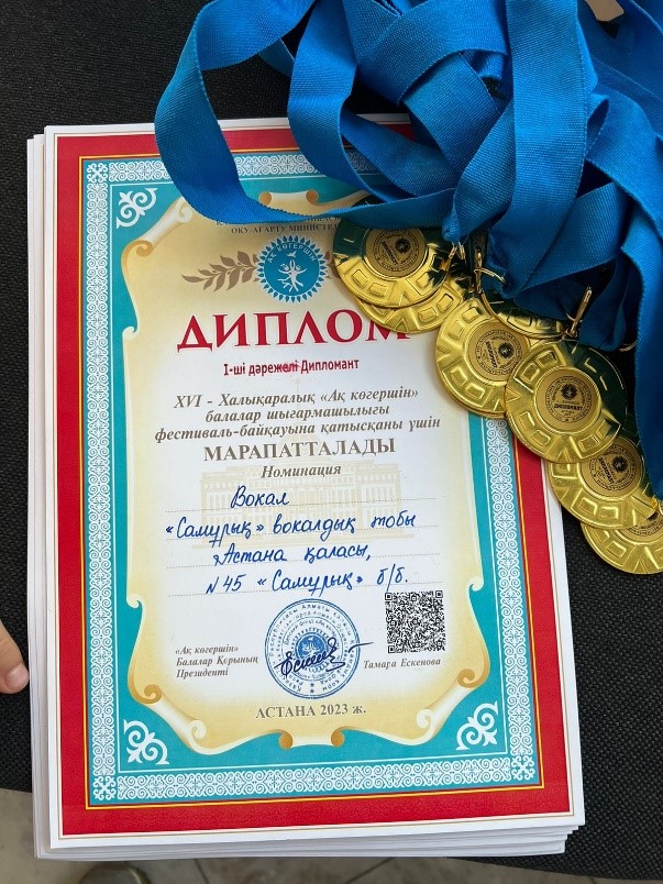 «Арт-терапия басым бағыттағы №45 «Самұрық» балабақшасы» МКҚК ортаңғы «Алпамыс» тобының бүлдіршіндері 30-сәуірде балалармен жасөспірімдер арасында өткен XVI Халықаралық «Ақ көгершін» балалар шығармашылығы фестиваль-байқауына қатысты. Вокалдық «Самұрық» тобы «Әжемнің шайы» әнімен көрермендер хошеметіне бөленіп, жүлделі I орынға ие болды. Бүлдіршіндер аранайы дипломдармен, музыка жетекшісі Асылбекова Гульнара Кариполлиновна және топ тәрбиешісі Таурбаева Гүлзат Еслановна Алғыс хатпен марапатталды.